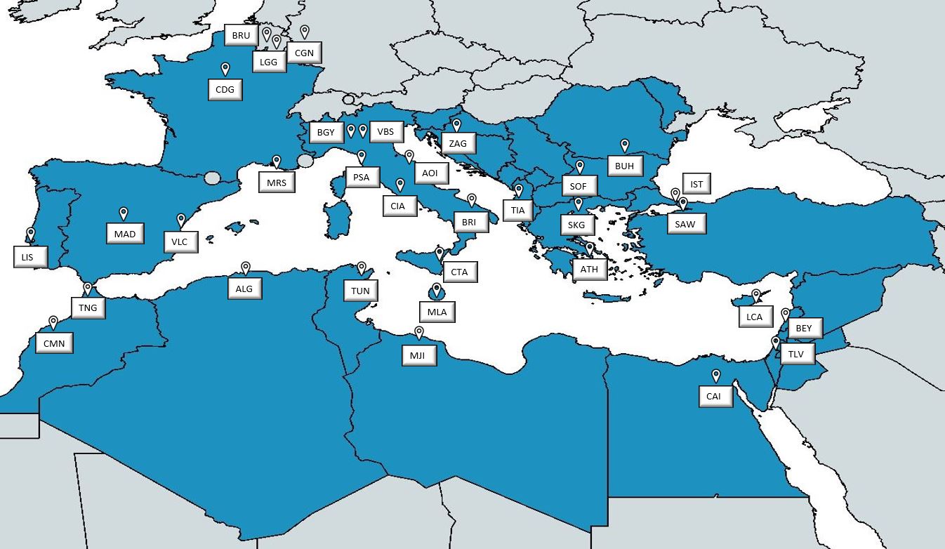 | Algeria, Egypt, Libya, Morocco, Tunisia | Israel, Jordan, Lebanon, Syria | Cyprus, France, Greece, Italy, Malta, Spain, Portugal | Albania, Bosnia and Herzegovina, Bulgaria, Croatia, Kosovo, Moldova, Montenegro, North Macedonia, Romania, Serbia, Slovenia, Turkey |